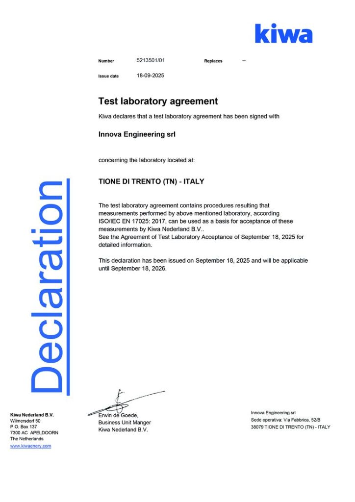 Un passaggio di grande rilievo per il settore HVAC, perché, oltre a conferire un valore ufficiale alle prove condotte nei laboratori di Tione (TN), i loro risultati potranno essere utilizzati sia da parte di un organismo terzo e indipendente come Kiwa, sia direttamente da INNOVA ai fini delle certificazioni, senza la necessità di ulteriori verifiche presso laboratori esterni.