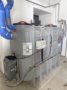 La rete di scarico dei reflui urbani è realizzata con tubazioni in polietilene ad alta densità, raccoglie anche la condensa prodotta dagli impianti di climatizzazione ed è dotata del degrassatore lungo la linea predisposta per la cucina.