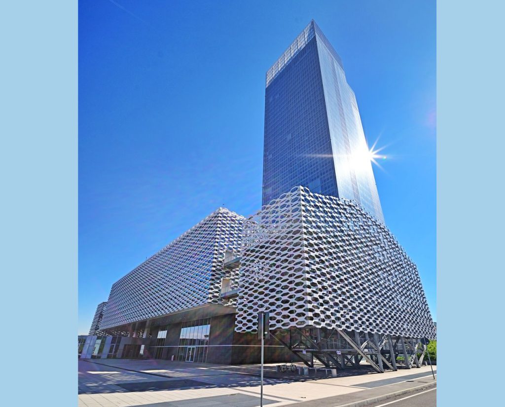 Il volume parallelepipedo della torre è racchiuso da un curtain wall a doppia pelle, affiancato sul prospetto est da un’imponente hall a tutta altezza che sottolinea l’ingresso principale. Sul prospetto rivolto a sud quattro campate della facciata continua sono equipaggiate con superfici fotovoltaiche (circa 1.000 m2). La vegetazione è presente al piede, nella corte interrata, e in elevazione, con giardini pensili distribuiti sul prospetto nord e all’ultimo piano.