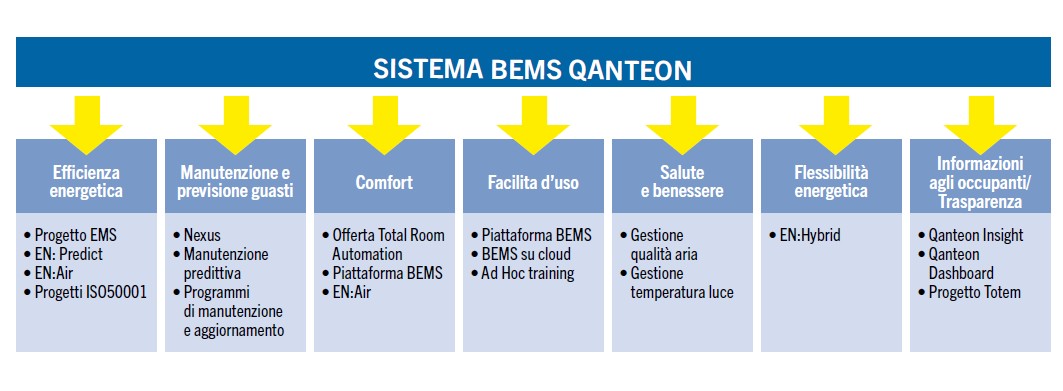 Qanteon coniuga la gestione integrata del sistema edificio-impianti (BMS) e dell’energia (EMS) in un’unica piattaforma software, caratterizzata da un’interfaccia semplice e intuitiva che aiuta gli utenti a comprendere rapidamente gli stati operativi e i flussi energetici. Sul fronte della gestione dell’edificio, Qanteon integra le funzioni di un potente BMS con quelle di una BACnet Advanced Operator Workstation. Si tratta infatti del primo sistema del suo genere conforme a DIN EN ISO 16484-5.