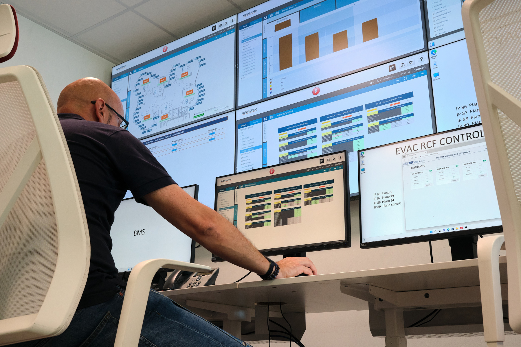 La produzione dei fluidi termovettori è affidata a pompe di calore acqua/acqua e aria/aria. La rete aeraulica è articolata in rami primari, con UTA che trattano l’aria al set-point standard, e secondari, con UTA installate ai vari piani per la finitura in base ai fattori ambientali locali (esposizione solare, carichi interni). Kieback&Peter ha svolto un ruolo fondamentale per la messa a punto di un BEMS perfettamente rispondente a queste complesse esigenze.