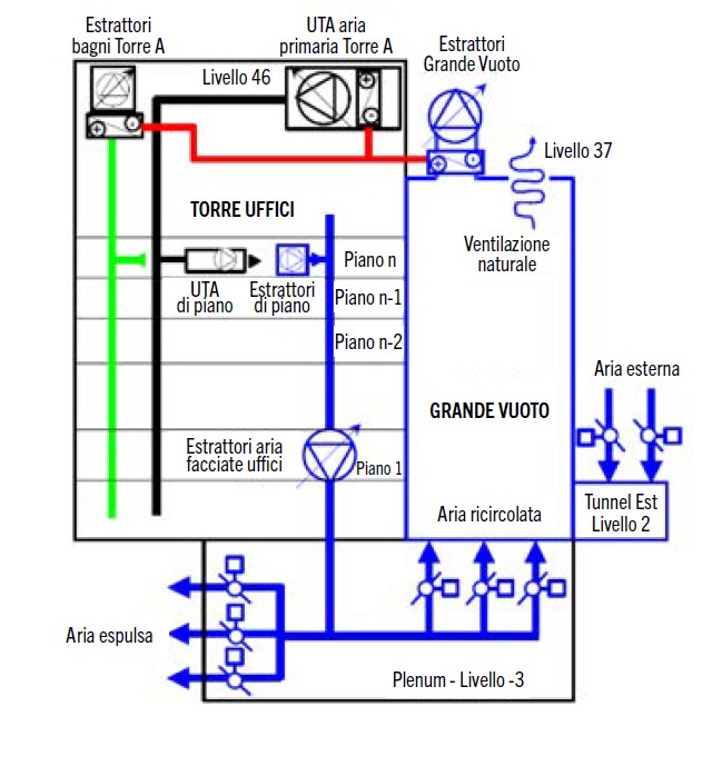 articolato in rami primari e secondari, con UTA ai vari piani per la finitura