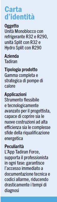 In conclusione, la nuova gamma Tadiran si presenta al termotecnico non solo come una collezione di macchine ad alta efficienza (A+++), ma come un sistema integrato di soluzioni (R290, 80 °C) e servizi digitali (Tadiran Force) progettati per massimizzare la performance energetica e semplificare ogni fase del ciclo di vita dell’impianto, dalla progettazione all’assistenza.